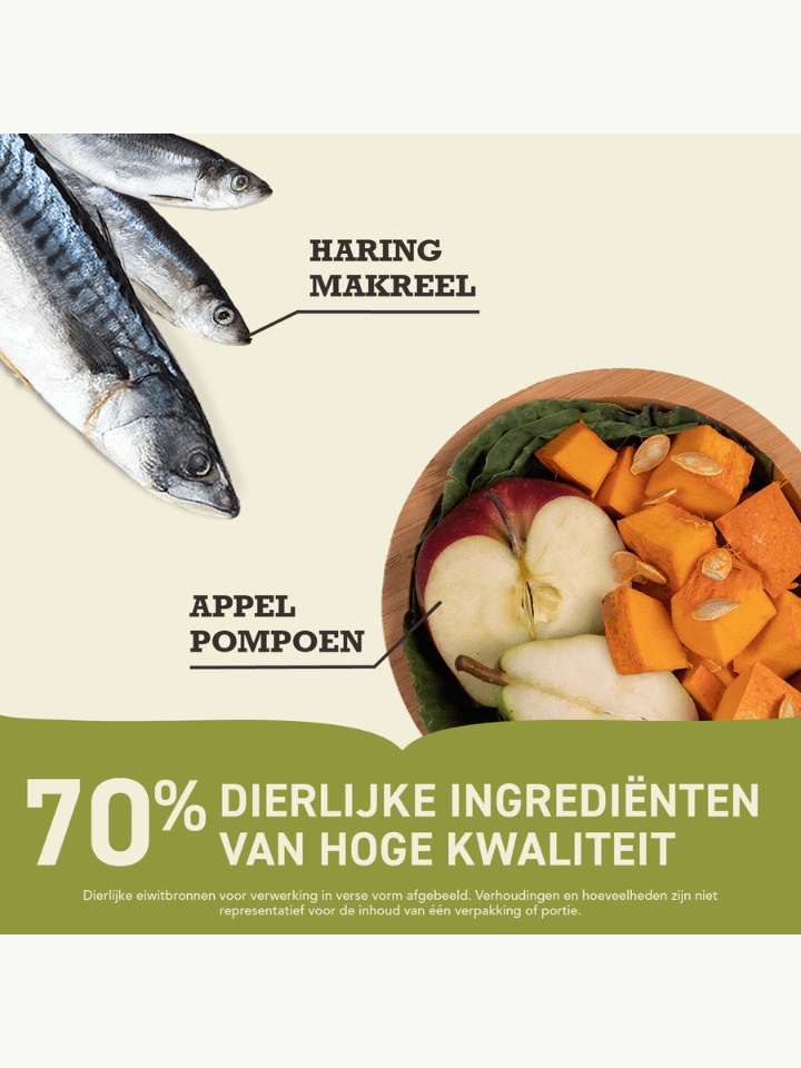 Samenstelling: Rauwe hele haring (14%), Rauwe hele makreel (11%), rauwe platvis (9%), haring meel (7%), makreel meel (7%), blauwe wijting meel (7%), hele groene erwten, hele rode linzen, hele kikkererwten, hele groene linzen, visolie (6%), rauwe hele heek (4,5%), rauwe hele roodbaars (4,5%), hele pinto bonen, hele gele erwten, erwtenzetmeel, zonnebloemolie, linzen vezel, gedroogd zeewier, gevriesdroogde kabeljauw en lever, verse hele pompoen, verse hele muskaat pompoen, verse hele wortels, verse hele appels, verse hele peren, verse hele courgette, gedroogde cichoreiwortel, verse boerenkool, verse spinazie, verse raapstelen, vers bieten loof, hele veenbessen, hele bosbessen, hele Saskatoon bessen, kurkuma, mariadistel, kliswortel, lavendel, heemstwortel, rozenbottels.