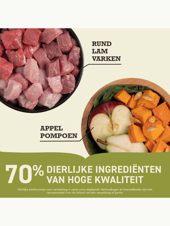 Samenstelling: Rauw rundvlees (9%), rauw lamsvlees (8%), rauw varken (8%), rundvlees meel (8%), lamsvleesmeel (8%), varkensvlees meel (7%), hele groene erwten, hele rode linzen, hele kikkererwten, rundvlees vet (5%), rauwe runder lever (4%), rauwe varkenslever (4%), rauwe zoetwatervis* (4%), hele groene linzen, hele pinto bonen, hele gele erwten, erwtenzetmeel, rauw bizon vlees (2%), visolie (2%), linzen vezel, rauw lams vlees (0,5%), rauwe lams pens (0,5%), gedroogd zeewier, zout, gevriesdroogde rund en lever, verse hele pompoen, verse hele muskaat pompoen, verse hele wortels, verse hele appels, verse hele peren, verse hele courgette, gedroogde cichoreiwortel, verse boerenkool, verse spinazie, verse raapstelen, vers bieten loof, hele veenbessen, hele bosbessen, hele Saskatoon bessen, kurkuma, mariadistel, kliswortel, lavendel, heemstwortel, rozenbottels. *gevarieerde mix van rauwe tullibee, witvis, snoek en mul.