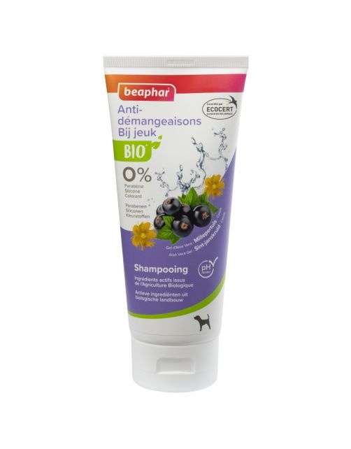 De Beaphar Shampoo bij Jeuk is geschikt voor honden met een gevoelige of geïrriteerde huid, bijvoorbeeld door insectenbeten. Hij bevat Aloë Vera Gel afkomstig uit biologische landbouw, die de huid hydrateert en de vacht verzacht. Het Ecocert label garandeert de natuurlijke oorsprong van de gebruikte ingrediënten. De shampoo, verrijkt met Sint-janskruid en Cassis, verzacht en beschermt de gevoelige huid. De neutrale pH-waarde van deze shampoo respecteert de vacht van je hond.