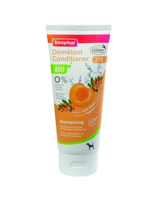 De Beaphar Shampoo met Conditioner reinigt en ontwart de vacht. Hij bevat Aloë Vera Gel afkomstig uit biologische landbouw, die de huid hydrateert en de vacht verzacht. Het Ecocert label garandeert de natuurlijke oorsprong van de gebruikte ingrediënten. De shampoo, verrijkt met Arganolie en Abrikozenpitolie, herstelt de soepelheid van de vacht waardoor het ontwarren gemakkelijker gaat. De neutrale pH-waarde van deze shampoo respecteert de vacht van je hond.