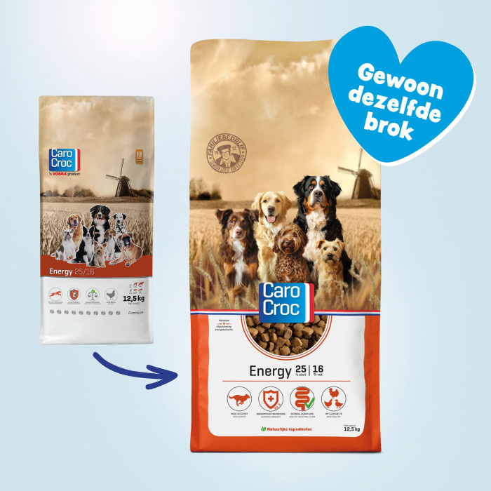 Voor de echte sporters onder ons is het van belang om een juiste brok te krijgen. Een brok die streng geselecteerde grondstoffen bevat waaronder; dierlijke eiwitten, vetten, vitaminen, mineralen, sporenelementen en granen. Dé ingrediënten die nodig zijn om je hond in topconditie te houden bij zware inspanning. De CaroCroc Energy maakt dit waar. Een goede en gezonde brok die uitermate geschikt is bij zware inspanningen zoals het werk dat politie-, bewakings-, ren en sledehonden verrichten. Ook voor drachtige teven vanaf een draagtijd van 42 dagen kunnen baat hebben bij deze brok. Door de vele energie die er verbruikt wordt bij grote inspanning is het natuurlijk logisch dat dit vraagt om een hoge energiebehoefte. De verbruikte energie moet namelijk ook weer aangevuld worden. De energie in de CaroCroc Energy hondenvoeding vormt zich door een uniek eiwit- en vetgehalte. Deze zijn dusdanig afgestemd dat jouw hond alle energie krijgt die hij nodig heeft. De brokken bevatten een eiwitpercentage van 25% en een vetpercentage van 16%. Deze percentages liggen een stuk hoger dan bij een gemiddelde volwassen hondenvoeding. Dit noemen we het voeren naar energiebehoefte, zoals de CaroCroc filosofie voorlegt. De CaroCroc Energy is geschikt voor volwassen die zware inspanning moeten verlenen. Het brokje heeft een diameter van 17mm.