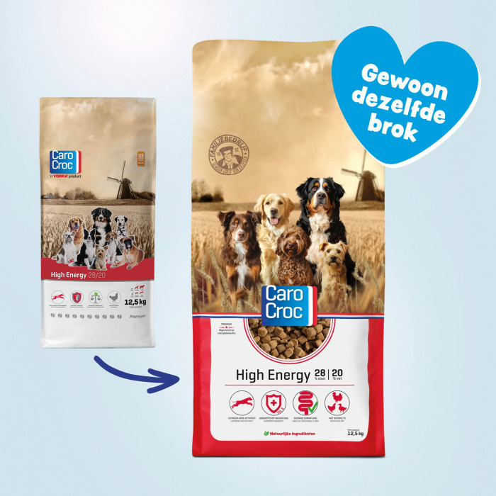 Carocroc 28/20 High Energy hondenvoer is een voeding voor honden die periodiek extreem hoge inspanningen en prestaties verrichten en daardoor een hoge energiebehoefte hebben. Denk hierbij aan honden die tijdens het jachtseizoen erg actief zijn of honden die aan agility of endurance doen en daardoor veel bewegen. Deze activiteiten kosten veel energie, dus het is belangrijk om uw hond op zo'n moment de juiste voeding te geven. Zo krijgt uw hond de goede voedingsstoffen binnen en kan uw hond blijven presteren.