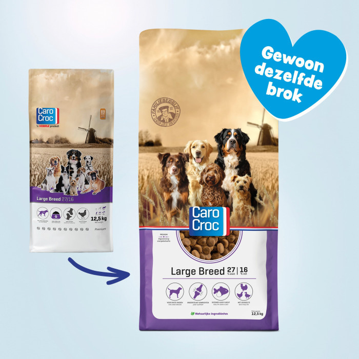 Honden van grote rassen schrokken over het algemeen vaker en dat vergroot de kans op maagkanteling. CaroCroc Large Breed is een extra grote brok van 25 mm. Zo wordt het schrokgedrag van jouw viervoeter verminderd. De grote, en vaak krachtige, lichamen van grote honden zijn extra gevoelig voor gewrichtsslijtage. De CaroCroc Large Breed brokken bevatten visolie en gelatine welke zorgen voor een goede ondersteuning van de botten en het kraakbeen. Hiernaast bevat CaroCroc Large Breed een optimale omega-3 en -6 verhouding, wat zorgt voor een stralende huid en vacht.