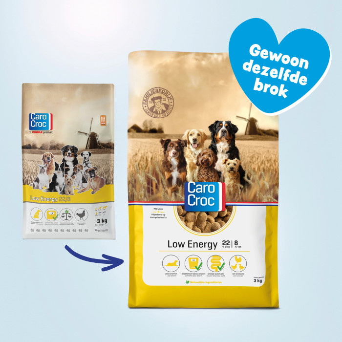Een hond met een lage lichamelijke inspanning heeft een lagere energiebehoefte dan een gemiddeld actieve hond. CaroCroc stemt de vetten en eiwitten in een brok altijd precies af op de hoeveelheid energie die een hond nodig heeft. Zo krijgt een gemiddeld actieve hond met CaroCroc Original 23% eiwit en 12% vet voorgeschoteld. Met een lagere energiebehoefte bevat CaroCroc Low Energy 22% eiwit en 8% vet. Dit noemen wij voeren naar energiebehoefte. Hiernaast bevat CaroCroc Low Energy een optimale omega-3 en -6 verhouding.