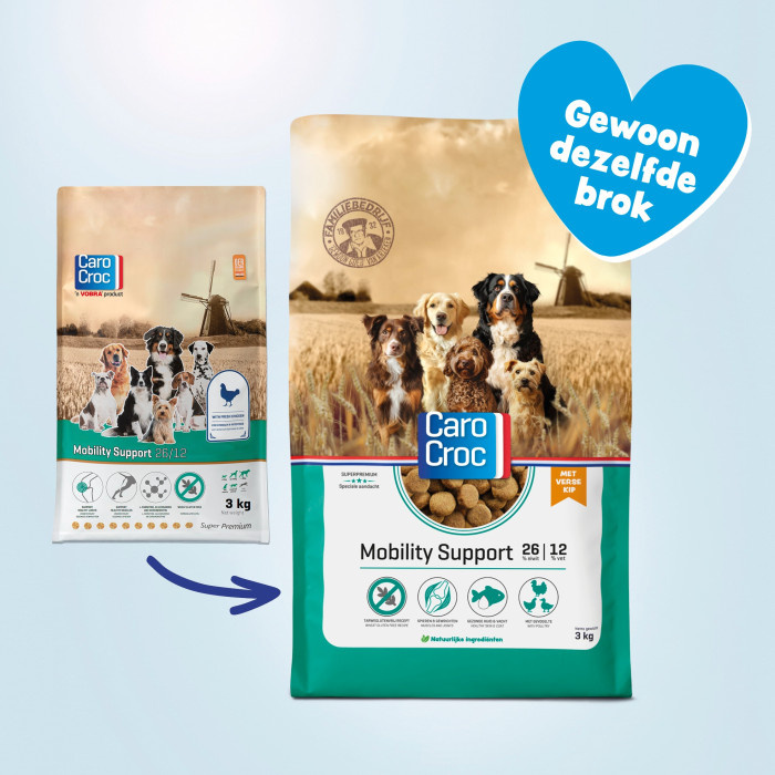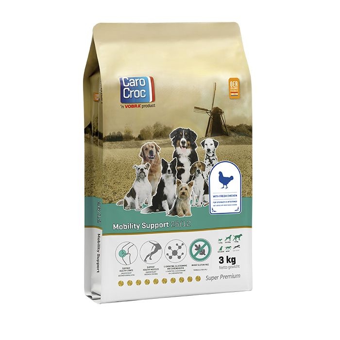 Sommige honden zijn extra gevoelig voor gewrichtsslijtage, zoals grote honden, breedgebouwde honden of honden met een lange of lage rug. Daarom is het belangrijk om hun gewrichten extra ondersteuning te bieden. CaroCroc Mobility Support ondersteunt deze honden bij het behoud van een goede lichaamsconditie.