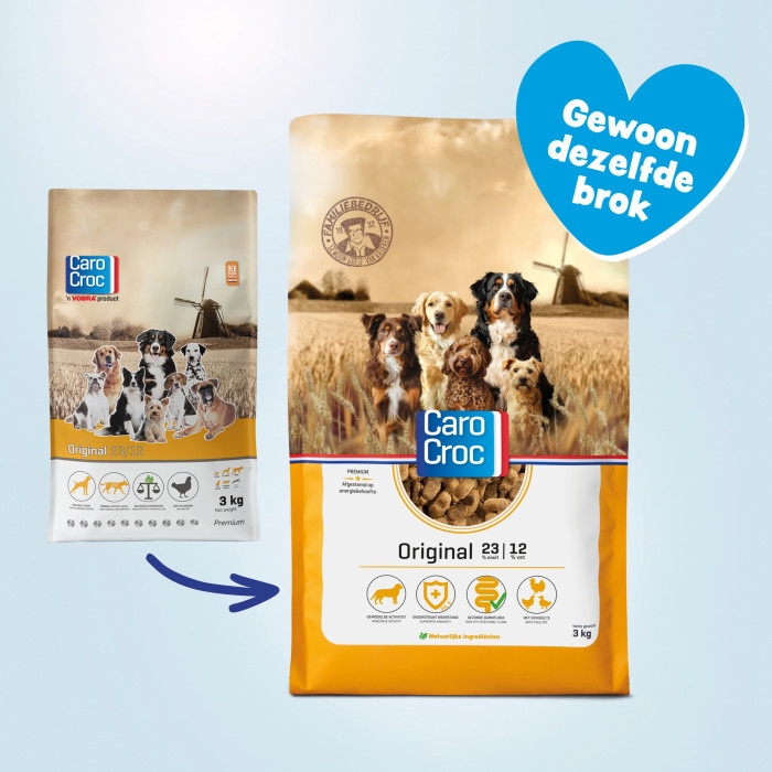 Heb je een volwassen hond? Heeft je hond een normale inspanning? En blijft je hond gemakkelijk op een gezond gewicht? Dan is de CaroCroc Original een geschikte keus voor jouw hond. De Original is een complete voeding geschikt voor de volwassen hond. De brokken bestaan uit een optimale verhouding van omega 3- en 6 vetzuren. Deze zijn van groot belang voor het functioneren van het lichaam van jouw trouwe viervoeter. Wist je dat honden hun energie voornamelijk uit eiwitten halen? Dit wordt niet alleen door de eigen CaroCroc experts beaamd, maar ook door externe experts. De CaroCroc Original bevat precies de optimale eiwit- en vetgehalte die een volwassen hondenvoeding nodig heeft. In dit geval is dat 23% eiwit en 12% vet. CaroCroc stemt de vetten en eiwitten in een brok altijd precies af op de hoeveelheid energie die een hond nodig heeft en dát is de CaroCroc filosofie; voeren naar energiebehoefte. De CaroCroc Original is geschikt voor volwassen honden van middelgrote rassen (tot 25kg). Het brokje heeft een diameter van 19mm.