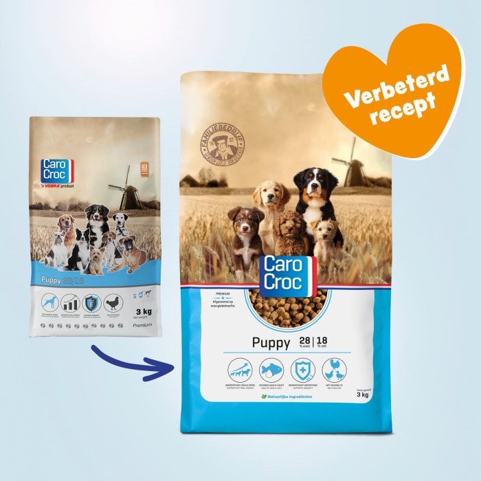 Vanaf de geboorte van een pup is deze volop in ontwikkeling. De keuze voor een juiste voeding is in deze fase van groot belang. Door de optimale verhouding van omega-3 en omega-6 vetzuren draagt de CaroCroc Puppy voeding bij aan een gezonde huid- en vachtconditie. Gist en vitamine E ondersteunen de weerstand van je puppy. Wanneer je kiest voor de CaroCroc Puppy dan weet je zeker dat het gewoon goed zit. Door de evenwichtige samenstelling van het puppy voer kan je pup zich optimaal ontwikkelen en legt hierdoor een stevige basis voor een gezond en vitaal hondenleven. De CaroCroc-filosofie is ook wel het voeren naar energiebehoefte. En door het unieke eiwit-vetgehalte in deze voeding krijgt jouw pup de juiste hoeveelheid energie binnen. De brokken bevatten 28% eiwit en 18% vet, dit percentage ligt hoger dan bij een gemiddelde volwassen honden voeding. Hierdoor krijgt jouw pup precies genoeg energie om zich volop te kunnen ontwikkelen! Deze voeding is geschikt voor pups van kleine tot middelgrote rassen (tot 20kg volwassen lichaamsgewicht). Het brokje heeft een diameter van 8mm.