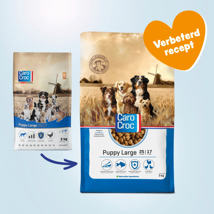 Pups van grote rassen mogen niet te snel groeien. Dit vergroot het risico op gewrichtsproblemen. CaroCroc Puppy Large 25/17 bevat een optimaal energiegehalte, eiwitgehalte en calciumgehalte voor een gelijkmatige groei.