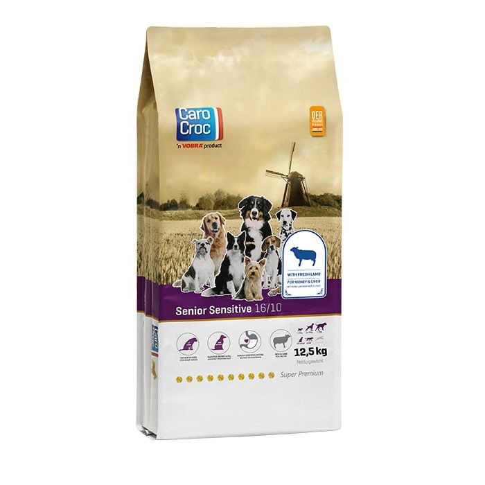 Een goed en licht verteerbare voeding is zeer wenselijk. De verse lam in de CaroCroc Senior Sensitive voldoet hier uitstekend aan. Door de hoge licht verteerbaarheid ondersteunt het oudere honden met een gevoelige huid, maag of darmen. Deze brok is daarnaast rijk aan veel antioxidanten, waaronder extra vitamine E, welke er zorg voor dragen dat de weerstand van je hond goed wordt ondersteund en cel veroudering tegengaat. De Omega 3- en 6 vetzuren dragen bij aan een gezonde nier- en leverfunctie. De CaroCroc Senior Sensitive is geschikt voor honden vanaf 7 jaar die duidelijke ouderdomsverschijnselen tonen. Het brokje heeft een diameter van 15mm.