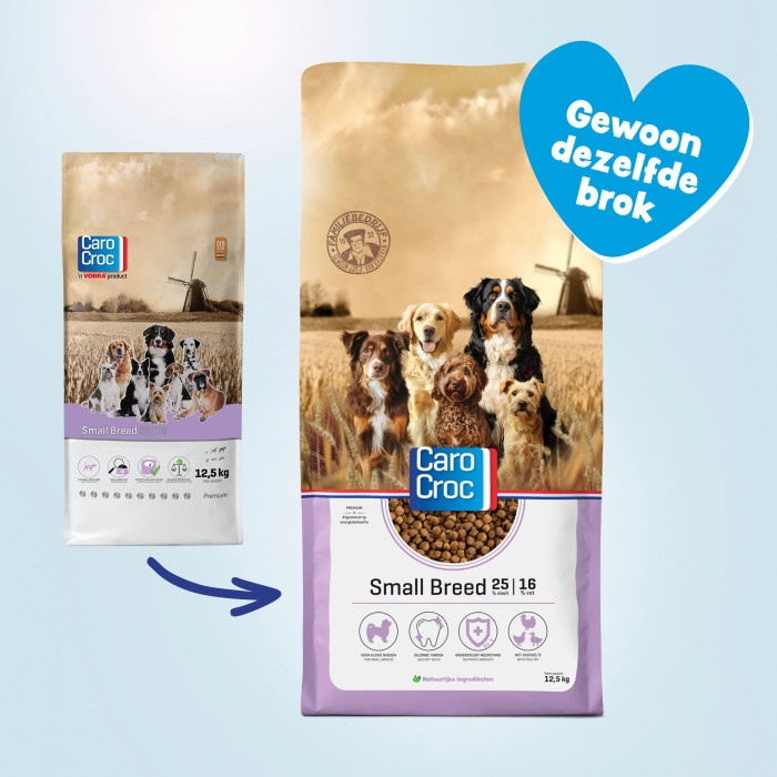 Onze kleinere viervoeters kunnen we niet volledig vergelijken met de grote viervoeters. Het gebit is in principe volledig hetzelfde, maar de ruimte daarin tegen niet! Doordat de tanden dichter op elkaar staan is er een grotere kans op het ontstaan van tandplak en tandsteen. Het is dus al van belang dat een voeding hier rekening mee houdt om een slechte adem en tandvleesontsteking te voorkomen. Ook hebben veel kleinere honden aanleg om gemakkelijk overgewicht te ontwikkelen. De CaroCroc Small Breed is specifiek samengesteld om deze specifieke behoeften te ondersteunen. De brokken stimuleren de vetafbraak, voorkomen tandplak en gaan cel veroudering tegen. Het brokje heeft een diameter van 11mm.