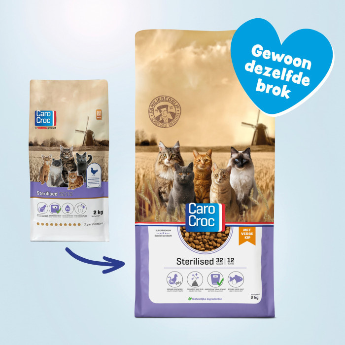 De CaroCroc Sterilised brokken zijn speciaal samengesteld voor gecastreerde en gesteriliseerde katten vanaf 6 maanden. De brokken kennen een lager eiwit- en vetgehalte, aangepast op de verlaagde energiebehoefte van de kat. Tevens zorgt de samenstelling voor schoon gebit, een goede gemoedstoestand, gezonde urinewegen en zijn nare geurtjes van de ontlasting verleden tijd.