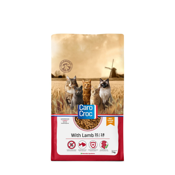 De CaroCroc With Lamb is een volledige voeding voor de volwassen kat. Zoals de naam het eigenlijk al zegt is deze voeding op basis van verse lam. De 'With Lamb' staat voor het hoge aandeel lamsvlees in deze voeding en is zeer smakelijk en licht verteerbaar. Een voeding op basis van 'lam' kan een uitkomst zijn wanneer je kat gevoelig reageert op bijvoorbeeld kip. Deze brok is daarbij ook tarwegluten vrij. De brokken bevatten prebiotica wat bijdraagt ter ondersteuning van gezonde darmen van jouw huistijger. Deze voeding bevat alle voedingsstoffen die jouw volwassen kat nodig heeft.