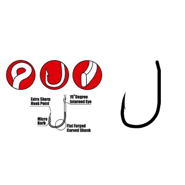 Een geweldige klauwhaak die meer dan goed inhaakt door de ultra dunne, scherpe punt en zijn 15-graden naar binnen gebogen oog. De wijdere gape maakt dat deze haak beter blijft zitten, zelfs onder grote druk. De naar binnen gerichte punt biedt daarnaast ook grote voordelen op een 'bumpy' bodem; ze blijven hier over het algemeen scherper dan haken met een rechte punt omdat ze veel beter beschermd zijn tegen bijvoorbeeld stenen.