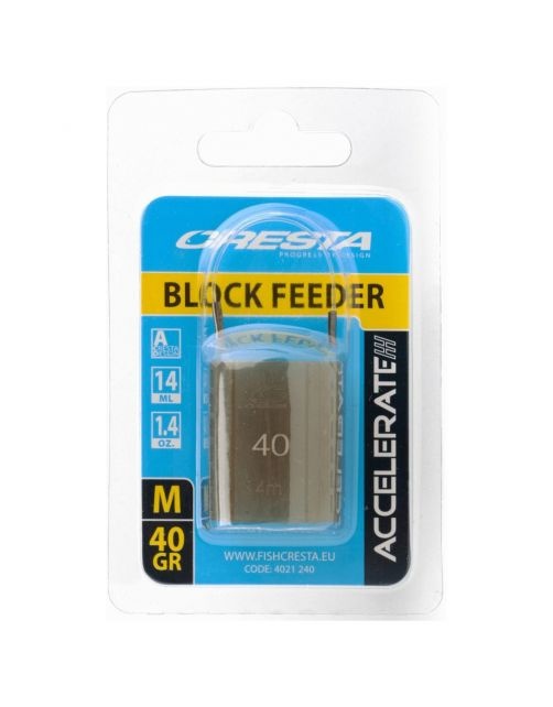 De Cresta Accelerate Blockfeeders zijn voorzien van een lus ter bevestiging. Die geeft een maximale bewegingsvrijheid aan de korf tijdens de worp, zodat deze gemakkelijk zijn balanspunt vindt, snelheid behoudt en tollen wordt voorkomen. Door het gewicht ook boven op de korf te vermelden, kan snel en gemakkelijk de juiste korf uit de opberg box genomen worden. De dichte bovenzijde zorgt ervoor dat deze korven gemakkelijk stijgen tijdens het binnendraaien, terwijl de openingen aan beide zijkanten zorgen voor grip en het gemakkelijk loskomen van het voer.
