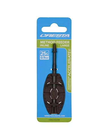 Het lichaam van de Accelerate Inline Method Feeder is vervaardigd uit een stuk metaal en voorzien van een baittable in het midden voor optimale presentatie van het haak aas. Dankzij de hardheid van het metaal kunnen pellets en of voer zeer gemakkelijk en effectief worden aangedrukt met behulp van de unieke 2 piece Compress Mould. De zacht aanvoelende camo coating maakt deze feeder zeer onopvallend aan de bodem De sleuf in de bodem en de uitneembare hard plastic tube met compacte afneembare sleeve, maken het wisselen of monteren van een elke Accelerate feeder zeer eenvoudig en snel. Dankzij het Integrated Stem Change system kunnen zowel Easy Fill Feeders als Method Feeders met elkaar uitwisseld worden.