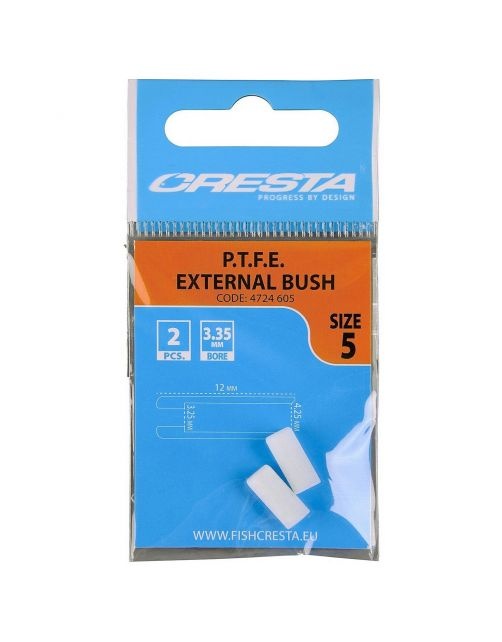 Deze serie bushes is gemaakt van hoogwaardig en ongekleurd P.T.F.E. materiaal, waardoor elke soort en diameter elastiek soepel, geleidelijk en met minimale frictie uit de hengeltop komt. Deze Externals dienen over de hengeltop geschoven te worden. Door de 8 verschillende maten is voor praktisch iedere top en diameter elastiek een uitvoering te vinden die mooi klemt, zodat de top niet ingekort hoeft te worden en lijm overbodig wordt.