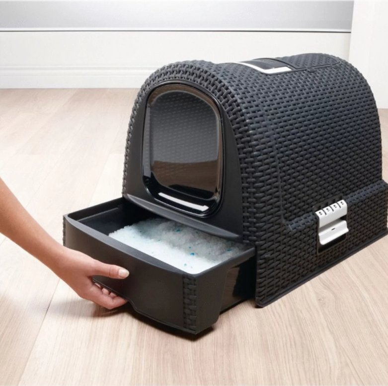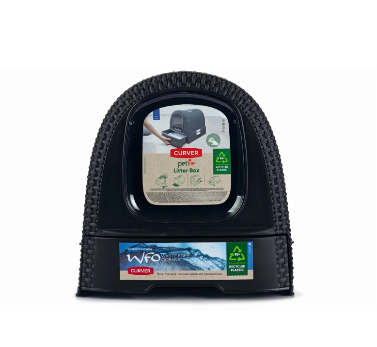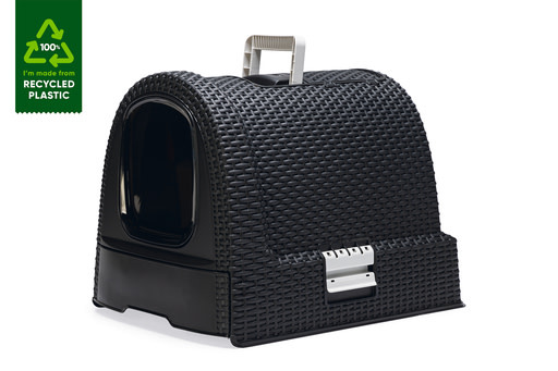 Deze Curver Kattenbak bestaat voor 95% uit gerecycled materiaal (huishoudelijk plastic afval en oude visnetten op de bodem van de zee (ocean waste)). De overige 5% zijn nieuwe grondstoffen. De hele kattenbak is op zijn beurt ook weer 100% recyclebaar. De kattenbak heeft een modieuze uitstraling doordat het een motief heeft van gevlochten rattan. De lade aan de voorkant heeft een plateau met gaatjes, waardoor de kat een groot deel van het kattenbakgrit achterlaat in de bak alvorens de kattenbak te verlaten. Door de uitschuifbare lade kan je in een oogopslag zien of de kattenbak aan verschoning toe is. Aan de bovenkant van de kattenbak bevindt zich een klepje waar de kattenbakschep opgeborgen kan worden. De Curver Kattenbak is zo mooi dat je nauwelijks ziet dat het een kattentoilet is.