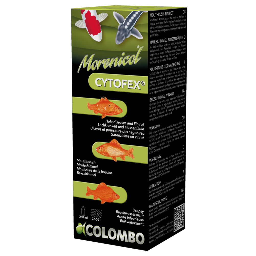 Colombo Morenicol Cytofex Cytofex is werkzaam tegen bacteriële infecties zoals huidzweren, ontstekingen, vinrot en gatenziekte. Cytofex bevat een breed spectrum antibioticum Enrofloxacine en het desinfectiemiddel Benzalkonium-chloride. Het is gebaseerd op 100% natuurlijke grondstoffen die een bewezen anti-bacterieel effect hebben, zoals Tea Tree olie, extract van IJslands mos en van de Pau d’Arco-boom. Dosering: 250 ml is goed voor een behandeling van 2500 liter vijverwater.