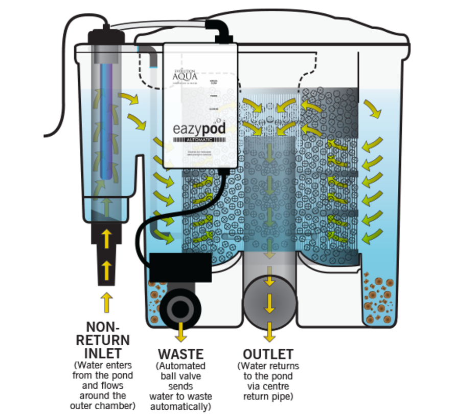 De EazyPod Automatic is een zelfreinigend, automatisch mechanisch en biologisch pomgevoed filter systeem voor (koi)vijvers tot 10.000 liter. Een schakelkast aan de zijkant van het filter bevat een instelbare timer die automatisch een reinigingscyclus start - zelfs als u er niet bent! De geintegreerde luchtpomp activeert automatisch het statische bed die bestaat uit 18 liter K1 micro media.