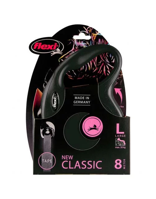 De Flexi Rollijn New Classic Band biedt beperkte vrijheid aan je hond en zorgt ervoor dat jij, door de rem in te drukken, je hond tot stilstand brengt. Dit is erg handig als je je in een gevaarlijke situatie bevindt. De lijn heeft een rolmechanisme dat het makkelijk maakt de lijn op diverse lengtes tot 8 meter in te stellen. Met Verchroomde haak om aan de halsband of het tuig vast te maken. Geoptimaliseerde ‘uitgang’ van de lijn, de lijn kan niet verdraaien of vast blijven zitten, hij rolt soepel op en af.