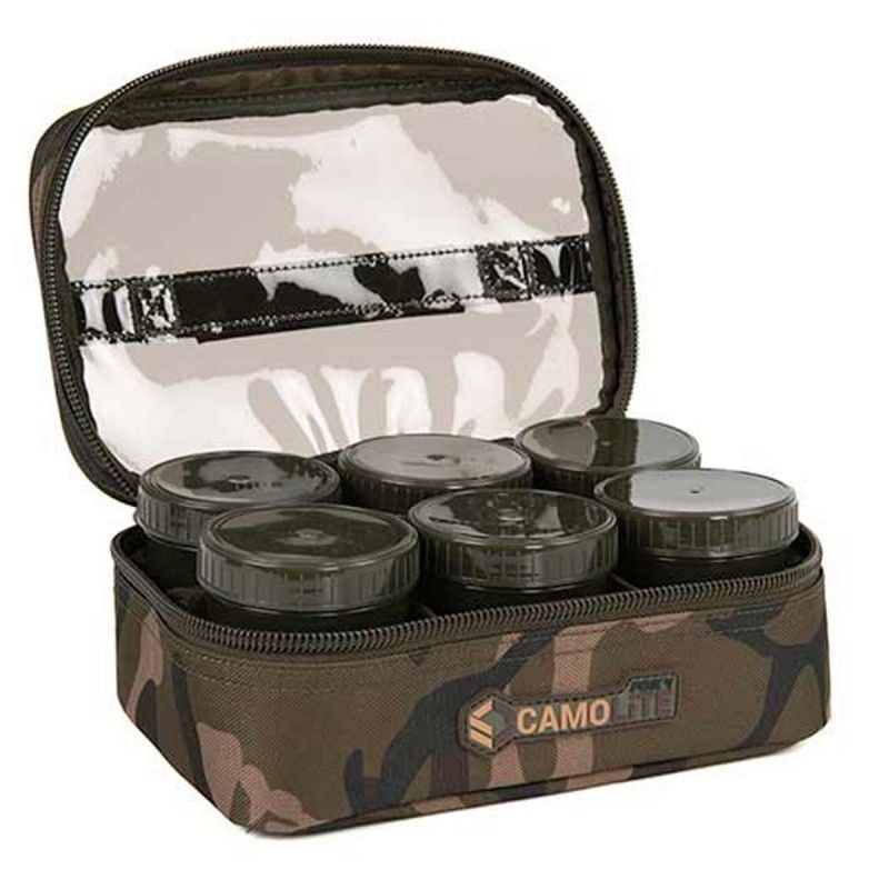 De Fox Camolite Hookbait Case is speciaal gemaakt voor het bewaren van je favoriete haakaas. De tas wordt geleverd met 8 potjes en dankzij de gevoerde verdelers heb je alles netjes en overzichtelijk bij elkaar in één tas.