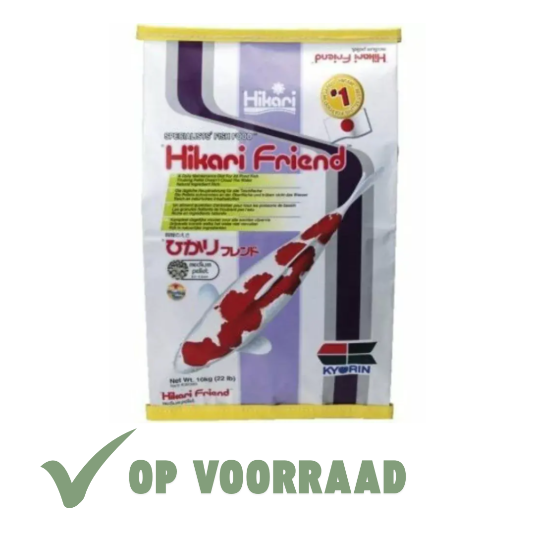 Hikari® Friend™ is veel voordeliger en voedzamer dan vijversticks! Vijversticks zijn licht van gewicht en bevatten weinig voedingsstoffen. Ze dragen nauwelijks bij aan de groei en ontwikkeling van de vijvervissen. Hikari Friend heeft een uitgebalanceerde samenstelling van voedzame ingrediënten voor een gezonde groei en ontwikkeling van de vissen. De drijvende korrels zijn gemakkelijk verteerbaar en vervuilen het vijverwater niet. - Bevat alle basis voedingsstoffen. - Uitgebalanceerde samenstelling van voedzame ingrediënten. - Bevat gestabiliseerde vitamine C voor gezonde vissen. - Drijvende korrels die snel zacht worden, zonder het water te vervuilen.