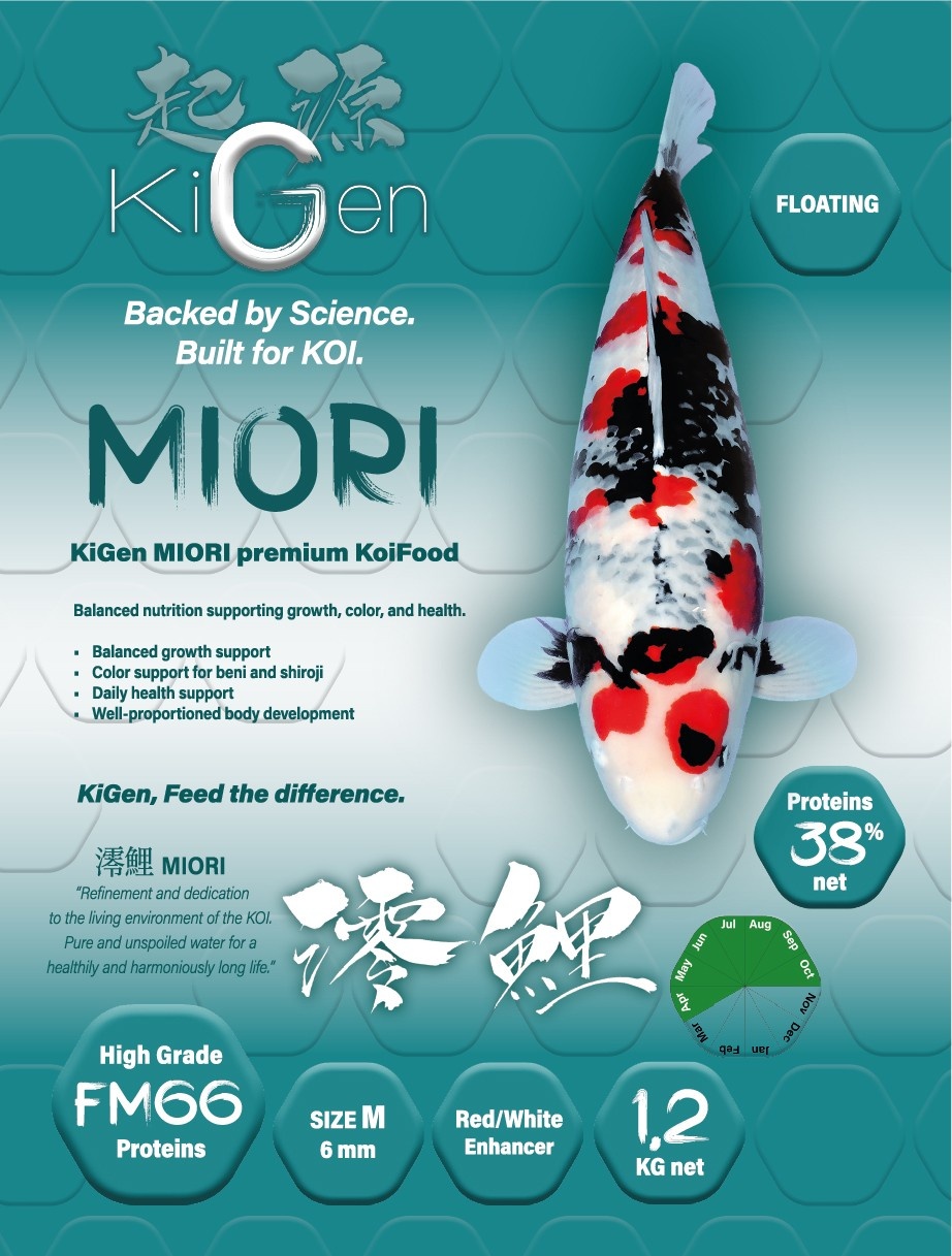 Miori ondersteunt een gelijkmatige, gebalanceerde groei en draagt bij aan een gezonde lichaamsontwikkeling bij dagelijks gebruik. De samenstelling helpt het natuurlijke kleurpatroon van koi te behouden, met aandacht voor zowel beni (rood) als shiroji (wit), zonder kunstmatige versterking of overmatige belasting. Daarnaast is het voer gericht op stabiele algemene gezondheid. Het ondersteunt vitaliteit en conditie, passend bij koi die regelmatig gevoerd worden en waarbij betrouwbaarheid en betaalbaarheid hand in hand moeten gaan. Het Miori resultaat is een eerlijk, degelijk koivoer voor liefhebbers die hun koi goed willen verzorgen, maar bewust kiezen voor een praktische en betaalbare oplossing. Met de zekerheid van de KiGen-kwaliteit als basis.