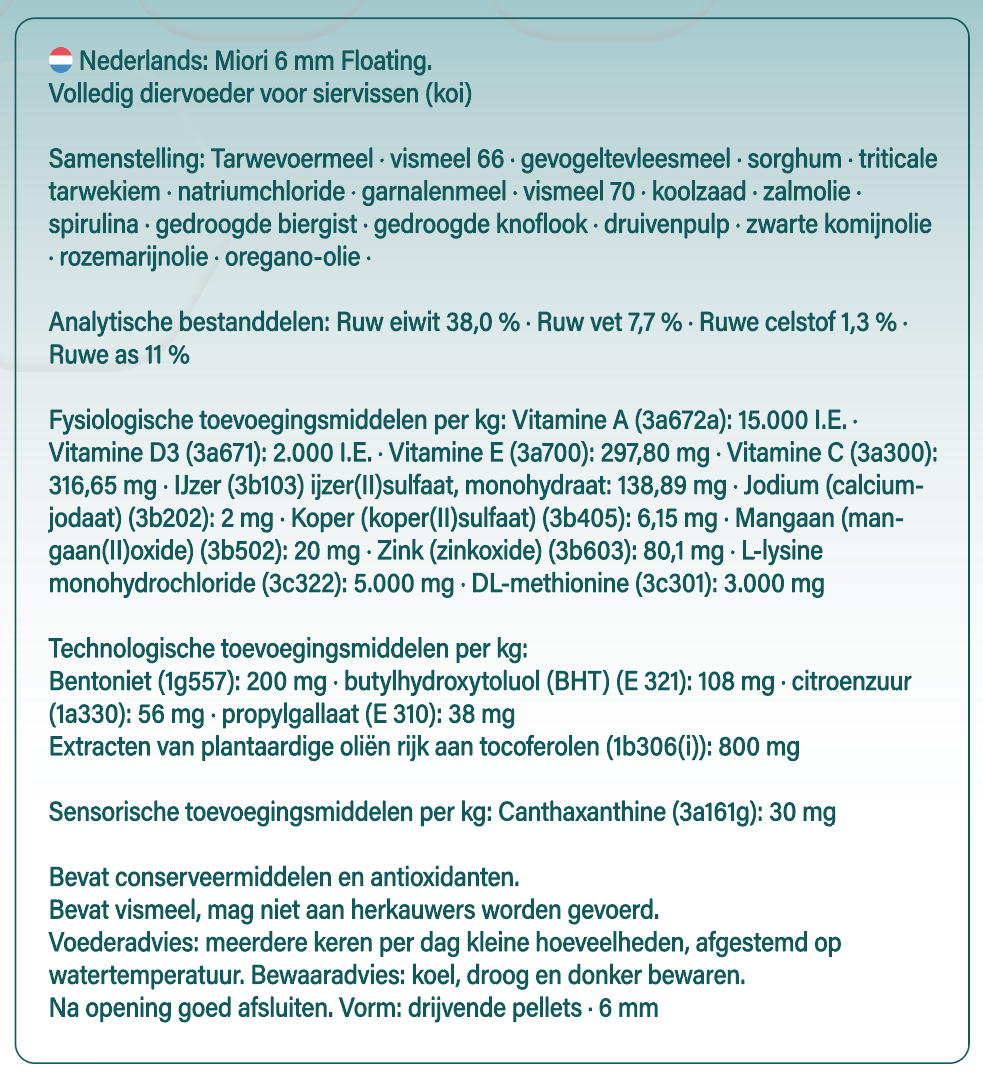 Het recept is samengesteld met zorgvuldig geselecteerde, maar bewust betaalbare grondstoffen. Daarmee is dit voer niet te vergelijken met onze absolute premium lijnen, waarin uitsluitend de meest hoogwaardige ingrediënten worden toegepast. Wat het wél biedt, is een betrouwbaar en evenwichtig voedingsprofiel dat in zijn prijsklasse duidelijk boven het marktniveau uitstijgt. Om een voorbeeld te noemen. Veel voermerken; dat geldt ook voor kwaliteitsmerken halen hun proteïnen uit het goedkope soja. KiGen heeft in het Miori voer gekozen voor een combinatie van hoogwaardig vismeel en gevogeltemeel. Daardoor hebben we nog steeds een geloofwaardige bron van eiwitten, waar de afvaldruk nog steeds lager is dan de meeste voeren in de markt. Ten aanzien van premix, koolhydraten en vet zijn geen verder concessies gedaan, waardoor Miori nog steeds een premium voer is, maar tegen een uitzonderlijk interessante prijs.