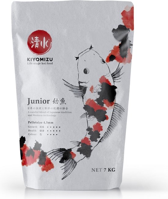 Jonge koi hebben een goede start nodig om te kunnen uitgroeien tot machtige Jumbo koi. Dankzij gemakkelijk verteerbare eiwitten kunnen ze goed groeien. De nodige vitaminen en mineralen zorgen ervoor dat hun lichaam en botstructuur goed ontwikkeld wordt. Evenwichtige, gezondheid- ondersteunende met immuniteit-boostende ingrediënten zijn ook essentieel. Kiyomizu Junior bevat alles wat een jonge koi nodig heeft.