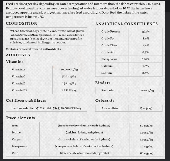 Jonge koi hebben een goede start nodig om te kunnen uitgroeien tot machtige Jumbo koi. Dankzij gemakkelijk verteerbare eiwitten kunnen ze goed groeien. De nodige vitaminen en mineralen zorgen ervoor dat hun lichaam en botstructuur goed ontwikkeld wordt. Evenwichtige, gezondheid- ondersteunende met immuniteit-boostende ingrediënten zijn ook essentieel. Kiyomizu Junior bevat alles wat een jonge koi nodig heeft.