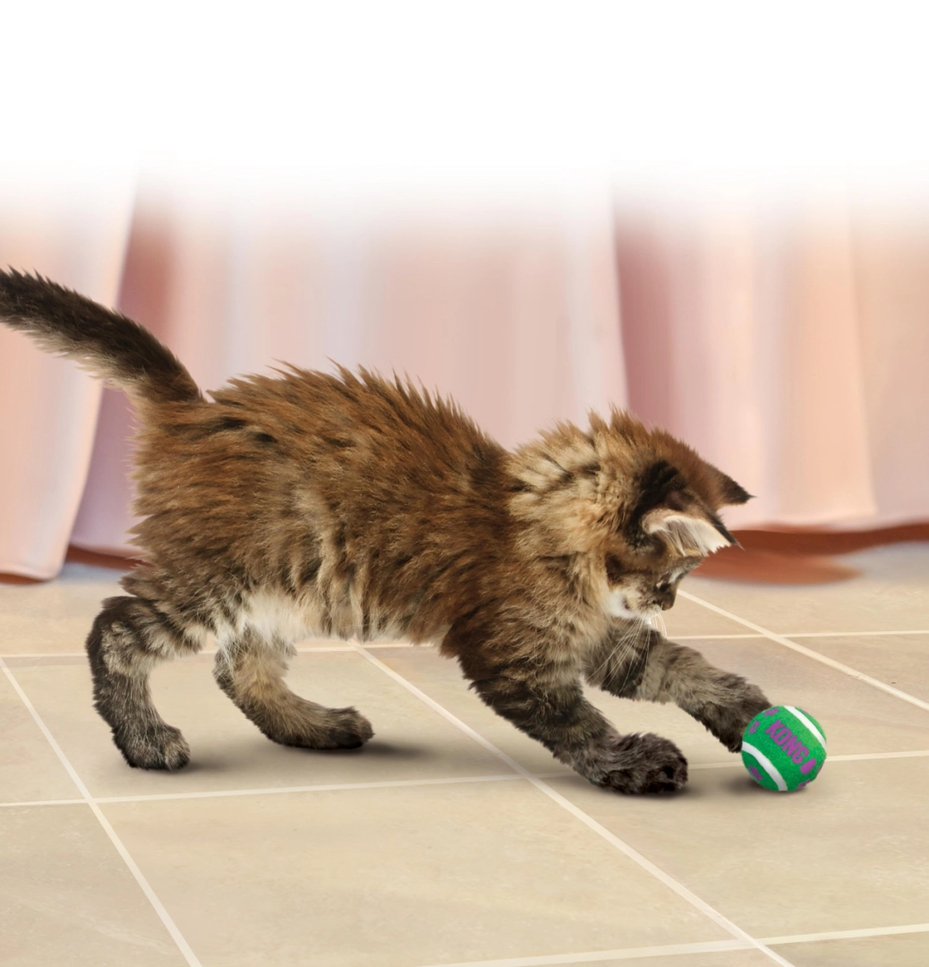 Wat hoort je kat daar? Een zacht belletje, een onweerstaanbaar geluid? Dat komt uit de Tennis Ball with Bells van KONG! Deze leuke balletjes bevorderen gezonde lichaamsbeweging en stimuleren de natuurlijke instincten van je kat. Ze zullen de balletjes achtervolgen, op jagen en vangen. De Tennis Balls zijn gemaakt van niet-schurend vilt en daardoor onschadelijk voor de tanden. De balletjes zijn 3,5 bij 3,5cm.