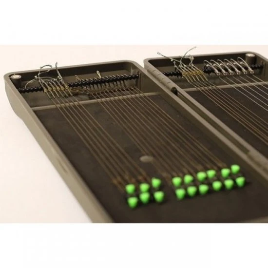 De Mini safe biedt plaats aan 60 rigs van een lengte van 20 centimeter. Net zoals de originele geeft dit compacte model dankzij het stevige design goede bescherming aan je onderlijnen en zorgt hij er zo voor dat deze tijdens transport niet beschadigd raken. Hij wordt geleverd met 30 standaard pins waarmee je de onderlijn eenvoudig vast zet. Daarnaast krijg je nu ook 15 zogenaamde “double pins” die voorzien zijn van twee punten. Deze double pins kan je gebruiken om onderlijnen waar je op het einde geen wartel of lus aan hebt geknoopt op hun plek te fixeren. De aluminium rand waar de haken achter zitten is voorzien van uitsparen. Hierdoor blijven de rigs op hun plek en zullen de haakpunten niet beschadigen.