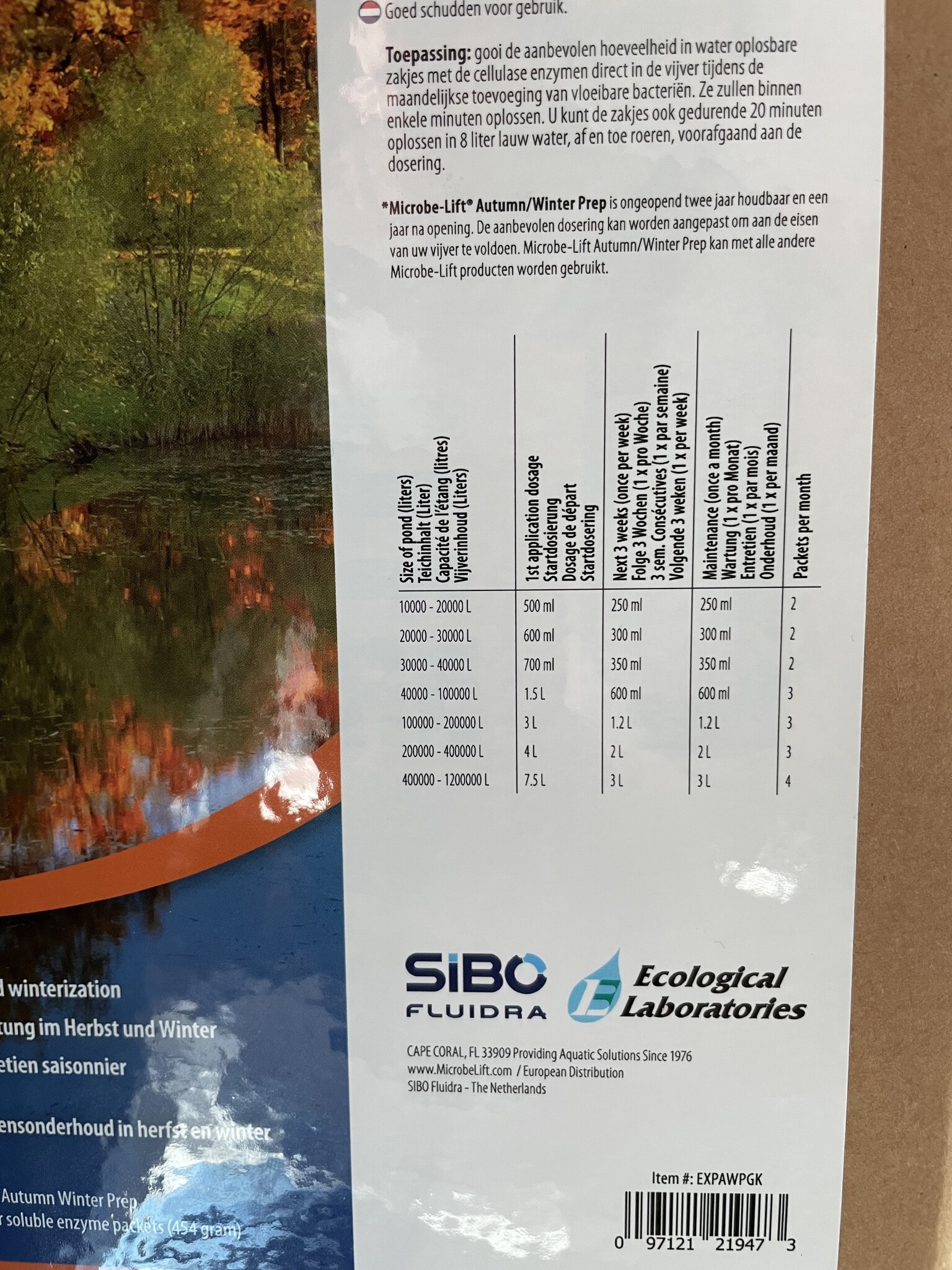 Microbe-lift Autumn Winter Prep is een speciale formule voor seizoensonderhoud in de herfst en winter. Microbe-lift Autumn Winter Prep versnelt de afbraak van bladeren, bezinksel en ander organisch materiaal tijdens de herfst- en wintermaanden. Het geeft uw vijver ook een voorsprong op een gezonder milieu in de lente.