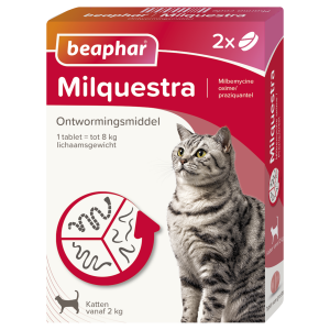 Beaphar Milquestra is een zeer breed ontwormingsmiddel voor katten vanaf 2 kg op basis van Milbemycine oxime en Praziquantel.