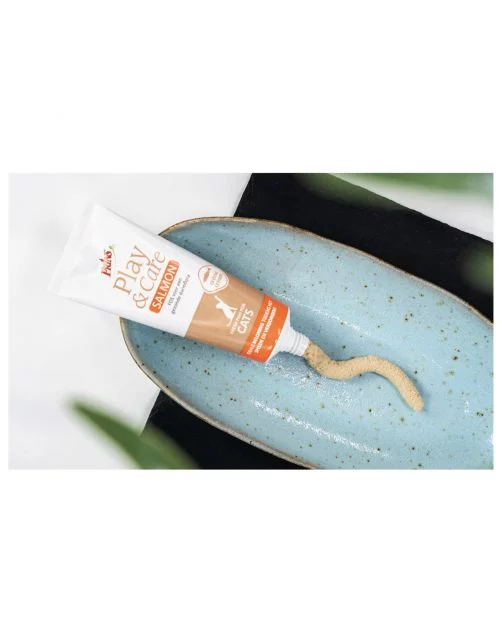 Play & Care Salmon bevat maar liefst 35% verse zalm en 10% zalmolie, deze zalm is de enige dierlijke eiwitbron in de paté. Er is FOS (fructo-oligosaccharide) toegevoegd ter ondersteuning van een gezonde darmflora. De tube bevat als extra ingrediënt taurine, een essentieel aminozuur dat een belangrijke bouwsteen voor het lichaam vormt bij katten. Alle nuttige ingrediënten in deze snack zijn een bron van eiwit, vetzuren, mineralen, vitaminen en vezels. De handige tube zorgt ervoor dat je de paté makkelijk kunt doseren en je de beloning rechtstreeks vanuit de tube kunt geven, zo heb je geen last meer van kruimels of vieze handen. Ook past de tube gemakkelijk in je zak en kan je deze overal mee naar toe nemen. De receptuur is zo samengesteld dat de crème de juiste structuur heeft, het is smeuïg genoeg om de paté goed uit de tube te krijgen.