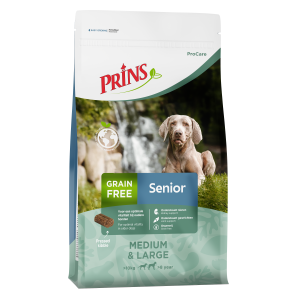ProCare Grainfree Senior Fit is een hoogwaardige graanvrije geperste voeding speciaal voor oudere honden vanaf een leeftijd van circa 8 jaar. Deze volledige voeding biedt ondersteuning aan honden op leeftijd. De met zorg geselecteerde ingrediënten ondersteunen de nieren, dragen bij aan soepele spieren en gewrichten, een gezond immuunsysteem en ondersteunen een evenwichtige darmflora. Zalmolie en een aangepast mineraalgehalte ondersteunen de nierfunctie.