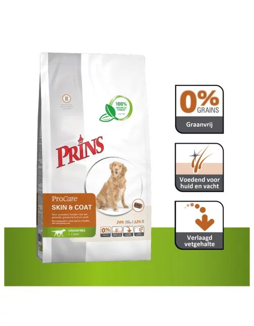 ProCare Grainfree Skin & Coat is een hoogwaardige graanvrije geperste voeding speciaal voor honden voor een gezonde, glanzende huid en vacht. Ook bijzonder geschikt voor honden met een gemiddeld energieverbruik. Dankzij een aangepast energiegehalte helpt deze voeding jouw hond in optimale conditie te blijven. De zorgvuldig geselecteerde ingrediënten dragen bij aan een gezonde huid en glanzende vacht, een optimale vertering en een evenwichtige darmflora. Graanvrije brok. 100% natuurlijk zonder kunstmatige geur, kleur- en smaakstoffen.