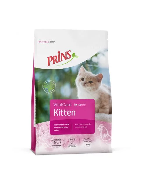 Deze krokante voeding is speciaal ontwikkeld voor kittens vanaf 4 weken tot circa 10-12 maanden en draagt bij aan een gezonde groei en ontwikkeling. De voeding is rijk aan alle essentiële voedingsstoffen die nodig zijn voor een goed werkend immuunsysteem en een optimale ontwikkeling van botten en gewrichten. Door het hoge energiegehalte is VitalCare Kitten ook geschikt voor drachtige en zogende katten. Geef je kitten de beste start in het leven met VitalCare Kitten!