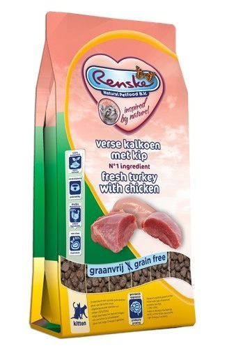 Geef jouw kitten een goede start met de complete, licht verteerbare en graanvrije kittenvoeding van Renske. De Kitten Verse Kalkoen/Kip van Renske bevat vers bereide kalkoen als hoofdingrediënt en ondersteunt een goede en geleidelijke groei van je kitten. De voeding bevat uitgebalanceerde eiwitten en vetten (32%/20%) en is extra smakelijk door het hoge vlees percentage. De voeding is graan- en glutenvrij en geschikt voor kittens van alle rassen vanaf 3 weken. Het brokje heeft een grootte van 5x5,5mm.