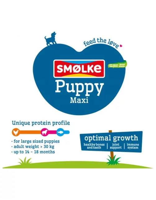Smølke Puppy Maxi is een complete Alles-in-één hondenvoeding, afgestemd op de behoefte van puppy's tot ongeveer 14-18 maanden en met een volwassen gewicht van boven de 30kg. De voeding is samengesteld zonder tarwegluten en bevat extra energie om je pup te helpen bij het optimaal groeien. Smølke Puppy Maxi is gemaakt met natuurlijke ingrediënten en heeft een uniek eiwitprofiel bereid met Nederlandse kip, MSC vis en Brits lam. Met Smølke Puppy Maxi geef je jouw pup gegarandeerd een goede start! Natuurlijk zonder kunstmatige geur, kleur en smaakstoffen en chemische antioxidanten.