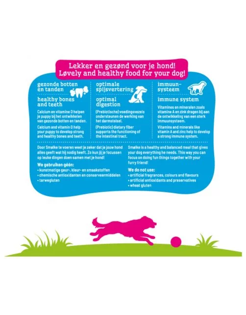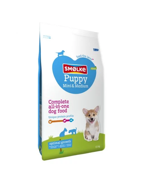 Smølke Puppy Mini-Medium is een complete Alles in één hondenvoeding, afgestemd op de behoefte van puppy's tot 10-12 maanden en met een maximaal volwassen gewicht van 30kg. De voeding is samengesteld zonder tarwegluten en bevat extra energie om je pup te helpen bij het optimaal groeien. Smølke Puppy Mini-Medium is gemaakt met natuurlijke ingrediënten en heeft een uniek eiwitprofiel bereid met Nederlandse kip, MSC vis en Brits lam. Met Smølke Puppy Mini-Medium geef je jouw pup gegarandeerd een goede start! Natuurlijk zonder kunstmatige geur, kleur en smaakstoffen en chemische antioxidanten.