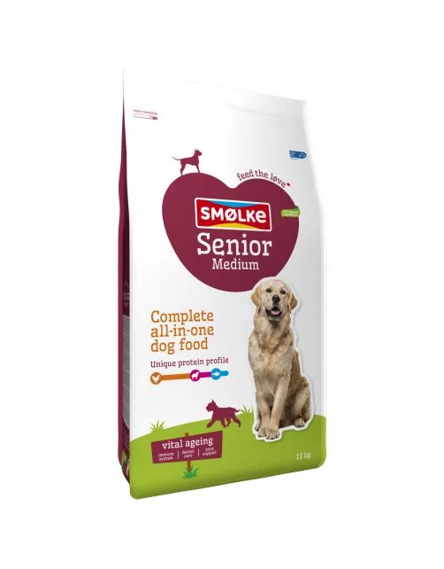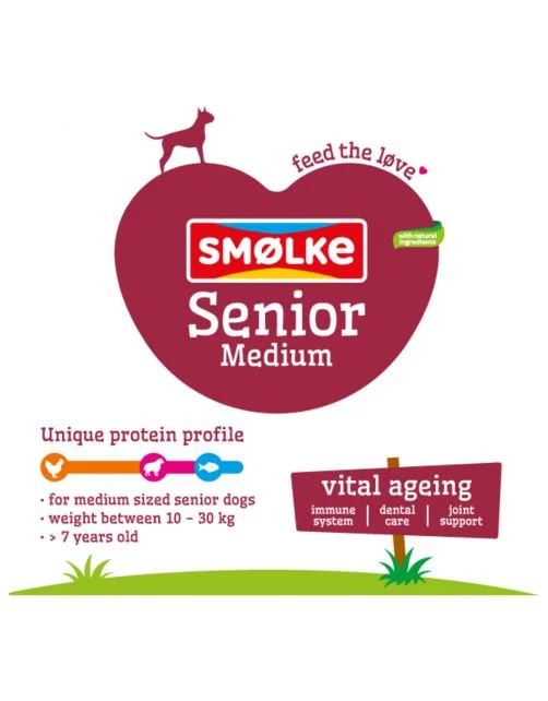 Smølke Senior Medium is een complete Alles-in-één hondenvoeding afgestemd op de behoefte van middelgrote honden vanaf ongeveer 7 jaar met een maximaal gewicht van ca. 30kg. De voeding is samengesteld zonder tarwegluten en bevat extra vitamine E om lichaamscellen te beschermen. Smølke Senior Medium is gemaakt met natuurlijke ingrediënten en heeft een uniek eiwitprofiel bereid met Nederlandse kip, MSC vis en Brits lam. Smølke Senior Medium is een gezonde en gebalanceerde voeding die je hond ondersteunt bij het vitaal ouder worden. Natuurlijk zonder kunstmatige geur-, kleur- en smaakstoffen en chemische antioxidanten.