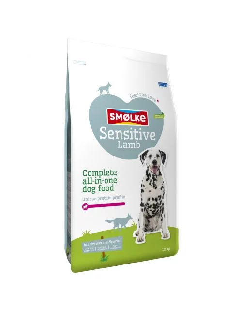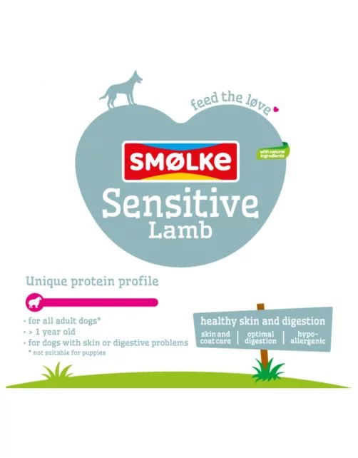 Smølke Sensitive is een complete Alles-in-één hondenvoeding speciaal ontwikkeld voor volwassen honden met huid- en vachtproblemen of verteringsproblemen. Deze hypoallergene voeding is samengesteld op basis van lam, rijst en aardappelzetmeel. Smølke Sensitive is gemaakt met natuurlijke ingrediënten en heeft een uniek eiwitprofiel bereid met Brits lam als enige dierlijke eiwitbron. Smølke Sensitive wordt geheel zonder gluten bereid en ondersteunt bij problemen door bepaalde eiwit allergieën of bij klachten veroorzaakt door een gevoelige spijsvertering. Natuurlijk zonder kunstmatige geur-, kleur- en smaakstoffen en chemische antioxidanten. Sensitive bevat dus slechts 1 hoogwaardige, dierlijke eiwitbron (lam). Hierdoor is deze voeding uitermate geschikt als eliminatiedieet in geval van een eiwitallergie, of als licht verteerbaar dieet in het geval van spijsverteringsproblemen.