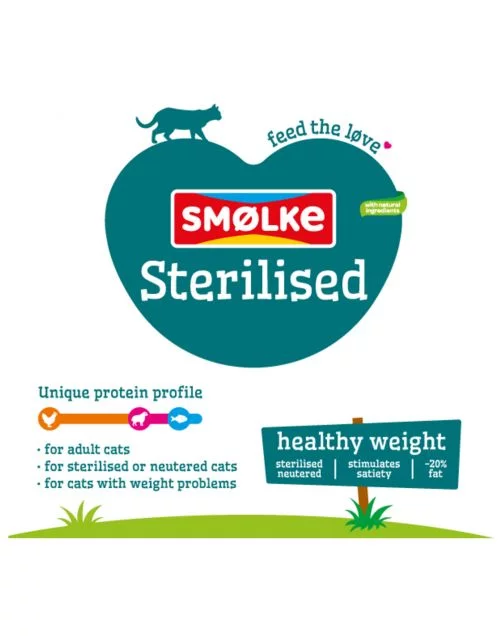 Smølke Sterilised is een complete Alles-in-één kattenvoeding speciaal ontwikkeld voor volwassen gesteriliseerde of gecastreerde katten en katten met de neiging tot overgewicht. De voeding is samengesteld zonder tarwegluten en bevat 20% minder vet dan de reguliere Smølke brokjes voor volwassen katten. Smølke Sterilised is gemaakt met natuurlijke ingrediënten en heeft een uniek eiwitprofiel bereid met Nederlandse kip, MSC vis en Brits lam. Smølke Sterilised helpt je (gesteriliseerde of gecastreerde) kat om op een gezond gewicht te komen of te blijven. Natuurlijk zonder kunstmatige geur-, kleur- en smaakstoffen en chemische antioxidanten.