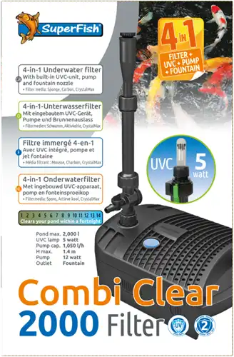 Met de Superfish Combi Clear heeft u een eenvoudig onderwaterfilter. Deze CombiClear is een vijverpomp, UVC, filter en fontein in één. Doordat u geen slangen hoeft te gebruiken en enkel deze pomp onderwater hoeft te plaatsen heeft u eenvoudig een 3 in 1 concept. Belangrijk is wel dat u de Combi Clear goed horizontaal en waterpas op de bodem plaatst. Met regelmatig onderhoud van het filter, weet u zeker dat u een filter koopt met een zo lang mogelijke levensduur.