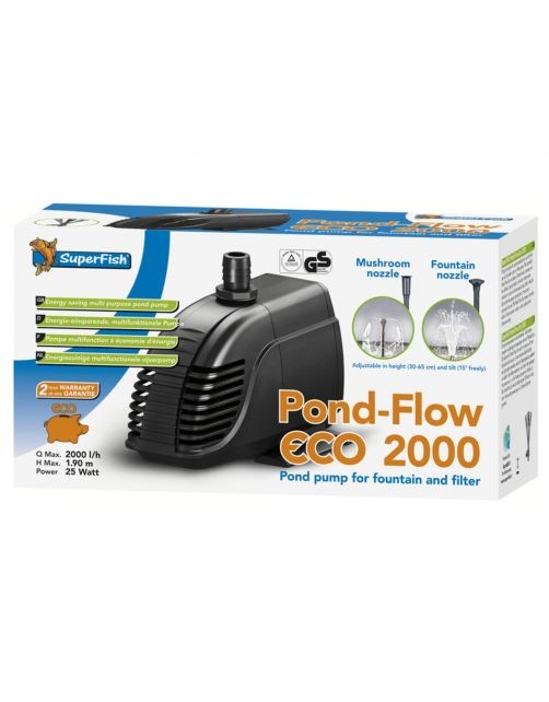 Met een SuperFish Pond Flow Eco 2000 heeft u een vijverpomp die multifunctioneel is. Deze vijverpomp kunt u gebruiken als fontein en als pomp voor de aansturing van uw vijver. Een Pond Flow eco 600 is een pomp die door het lage energieverbruik ideaal is in verschillende situaties en vijvers. Met twee jaar garantie en de mogelijkheid om de pomp in hoogte te verstellen heeft u met de aankoop van een pond flow eco een ideale fonteinpomp.