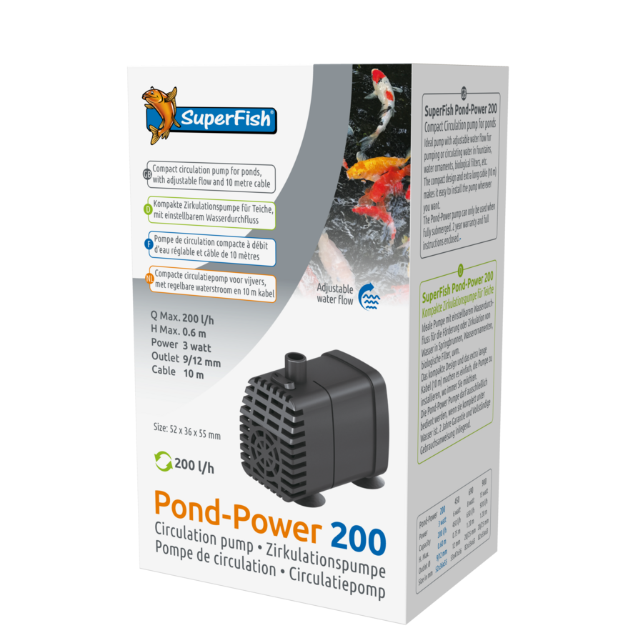 Door zijn extra compacte uitvoering is de Superfish Pond-Power 200 overal eenvoudig te installeren. De circulatiepomp van Superfish is ideaal voor het opvoeren en circuleren van water in fonteinen, waterornamenten en biologische filters.