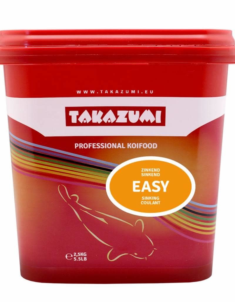 Takazumi Easy is een zinkend koivoer, speciaal bestemd voor de wat minder actieve (easy) koi die zich onttrekt aan de jacht op de pas gestrooide korrels en dieper in de vijver wacht op wat hem toevalt. Kan in elk jaargetijde gevoerd worden. Door het zinkende karakter en het lage vet- en medium proteïnegehalte is takazumi easy ook uitstekend als wintervoer te gebruiken. Zorgvuldig geselecteerde grondstoffen staan borg voor een kwalitatief hoogwaardige voeding die het water niet vertroebelt. De hoge verteerbaarheid draagt bij aan een betere waterkwaliteit en aanzienlijk mindere belasting van het filtersysteem. Takazumi garandeert de hoge productkwaliteit, bij ongeopende verpakking en juiste bewaarwijze, tot aan de houdbaarheidsdatum. Bij een watertemperatuur van 4º c of lager stoppen met voeren.