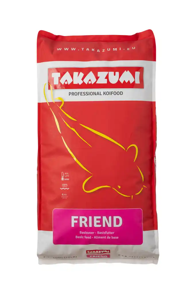 Takazumi Friend is een onderhoudend basisvoer voor koi. Takazumi Friend 10 kg is een volledig en voordelig koivoer dat kleur en groei ondersteunt. Het is ontwikkeld om in de grote behoefte aan een voordelig kwaliteitsvoer te voorzien. En Friend is echte kwaliteit; een voer mag niet zomaar Takazumi heten! Takazumi Friend zorgt voor gezonde, flinke en goed uitziende koi. De drijvende korrels van 6 mm zijn niet alleen vriendelijk voor uw vissen, maar ook voor het vijverwater (dat vertroebelt niet) en voor het filter (dat wordt niet extra belast). Takazumi Friend kan gevoerd worden bij watertemperaturen vanaf 12º C Gedoseerd voeren voorkomt vertroebeling van het water.