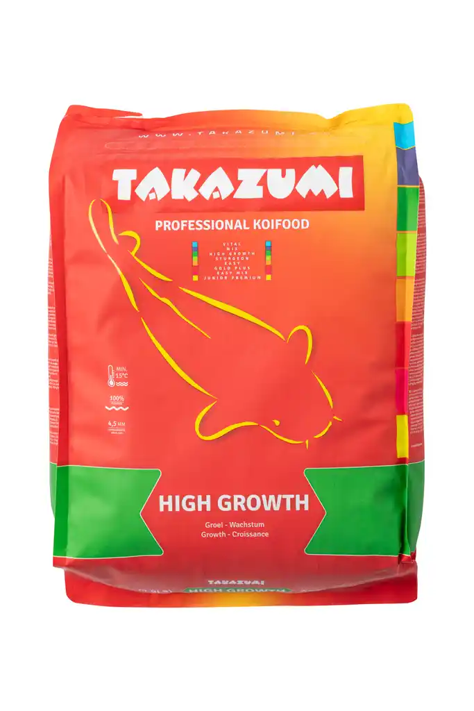 Takazumi high growth is een uitgebalanceerd professioneel krachtvoer met een hoog proteïnegehalte en een aminozuurprofiel dat een uitstekende groei mogelijk maakt. Bij Takazumi High Growth staan zorgvuldig geselecteerde grondstoffen borg voor een kwalitatief hoogwaardige voeding die het water niet vertroebelt. De hoge verteerbaarheid draagt bij aan een betere waterkwaliteit en aanzienlijk mindere belasting van het filtersysteem. Daarnaast zijn de korrels drijvend. Dat zorgt voor een overzichtelijk voedingsgedrag en minimalisering van de nadelige gevolgen van overmatig voeren. Alleen voeren bij een minimale watertemperatuur van 15º C. Tot slot voorkomt gedoseerd voeren vertroebeling van het water.